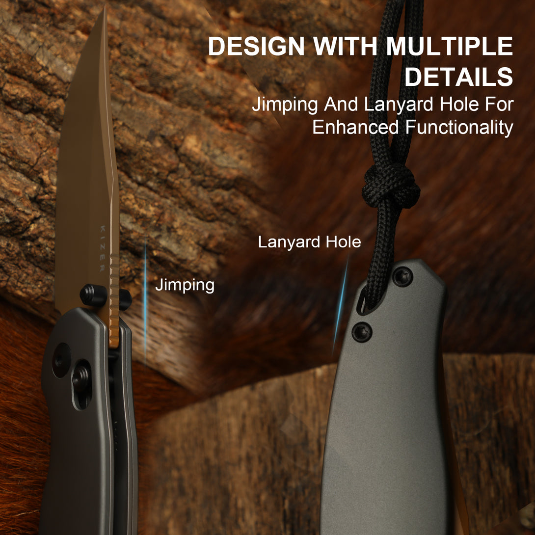 Kizer's proprietary Clutch Lock mechanism guarantees solid blade deployment and secure locking, while the ambidextrous thumb studs enable fluid one-handed operation from either side.