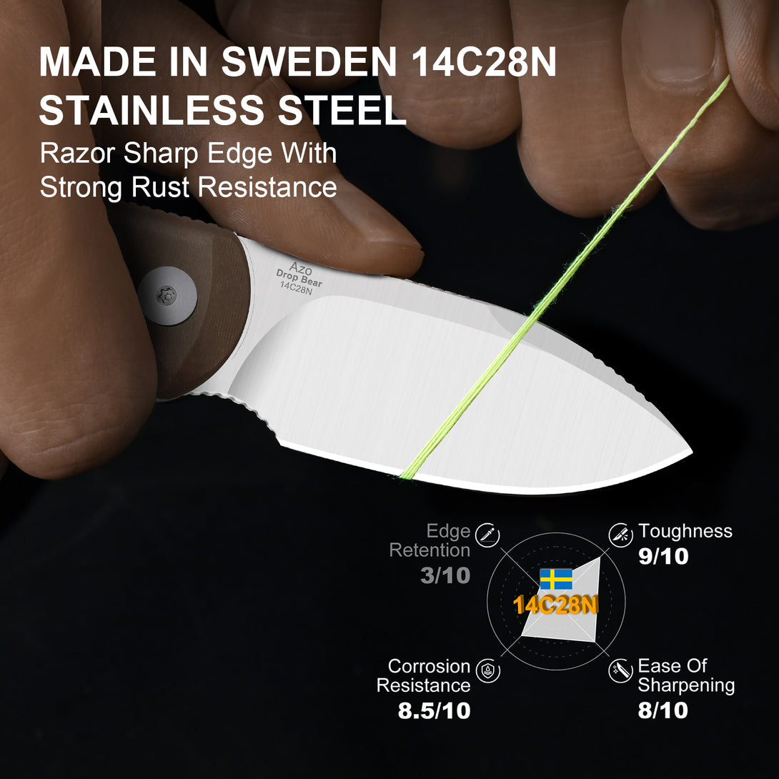 This steel delivers a razor-sharp edge that lasts through tough tasks, while its high chromium content fights rust effectively. It maintains solid toughness to resist chipping, and can be quickly resharpened even in field conditions. An ideal balance of performance and practicality for EDC, outdoor and tactical use.