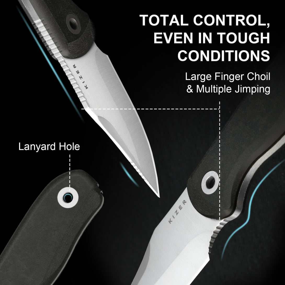 Extensive spine jimping and a generously sized finger choil guarantee a stable grip for everyday jobs. Meanwhile, forward jimping close to the tip allows for exact control during delicate work like carving, even when wet. The built-in lanyard hole provides more options for secure handling and customization.