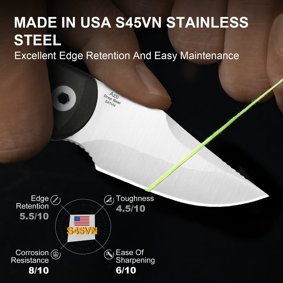 The blade is crafted from S45VN stainless steel, a premium powder metallurgy steel that offers an exceptional balance of edge retention, toughness, and stain resistance, making it an ideal choice for everyday carry and outdoor tasks.