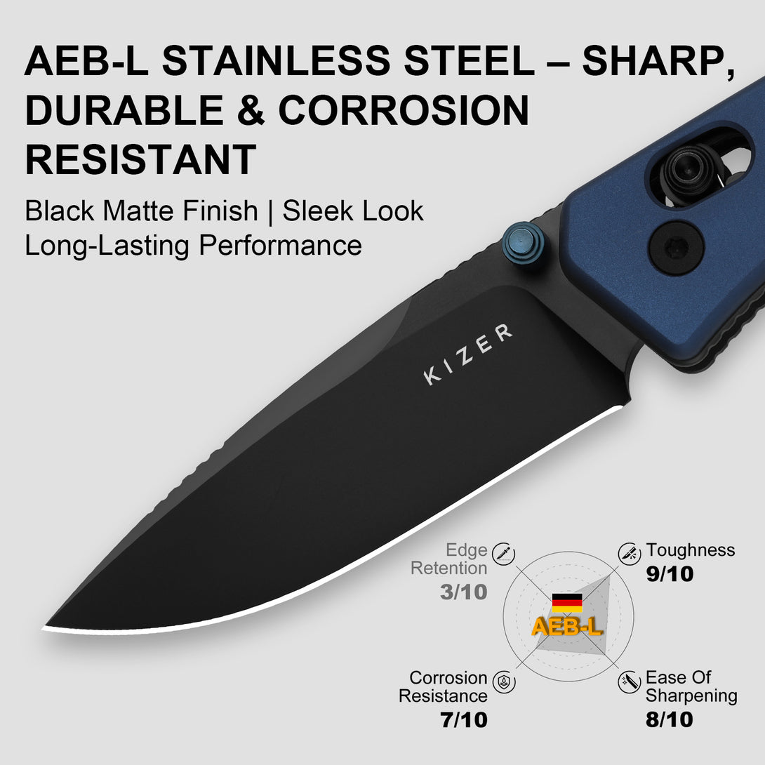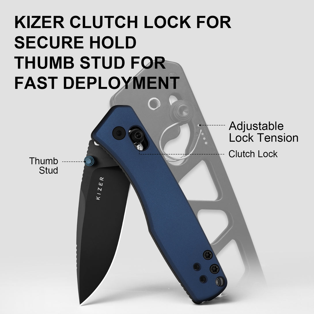 Equipped with a Kizer Clutch Lock featuring multiple tension adjustment holes for customizable lock tightness, ensuring a secure blade lock. A responsive thumb stud enables smooth one-handed deployment.