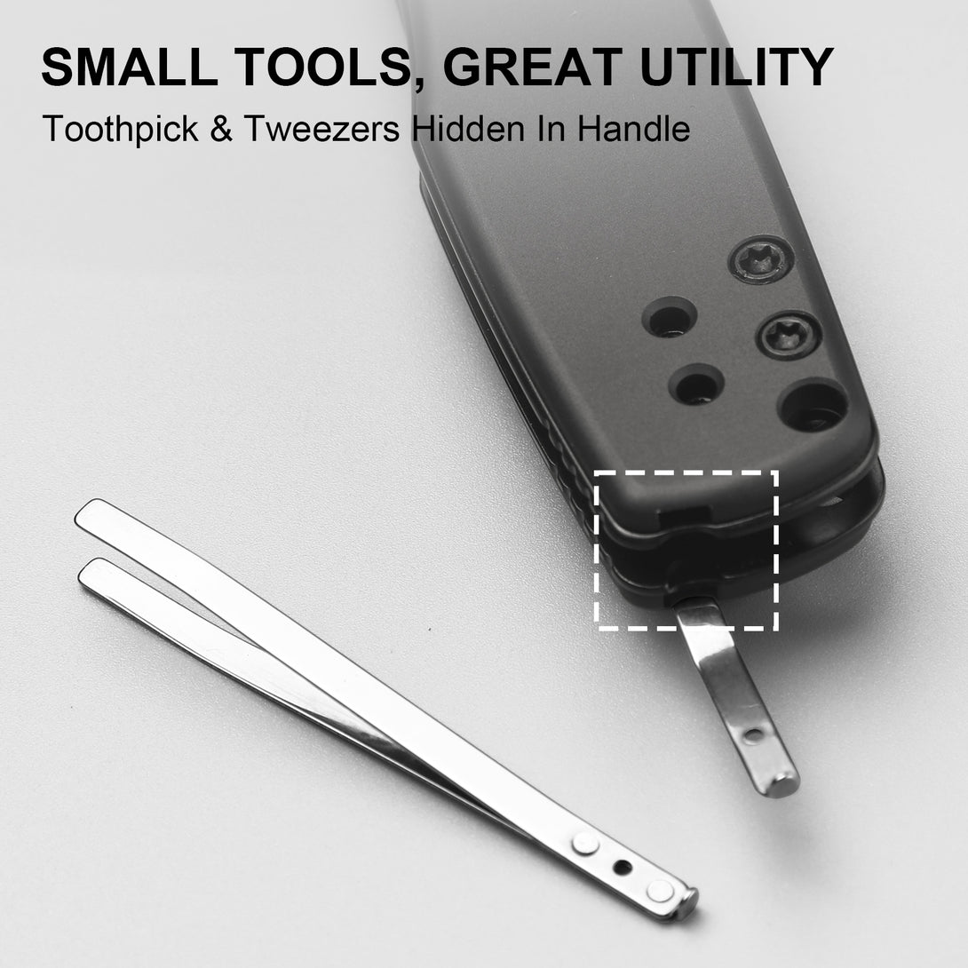 Cleverly integrated small tools boost EDC utility: the stainless steel toothpick and tweezers are discreetly housed inside the handle, allowing quick access while keeping the sleek exterior intact.