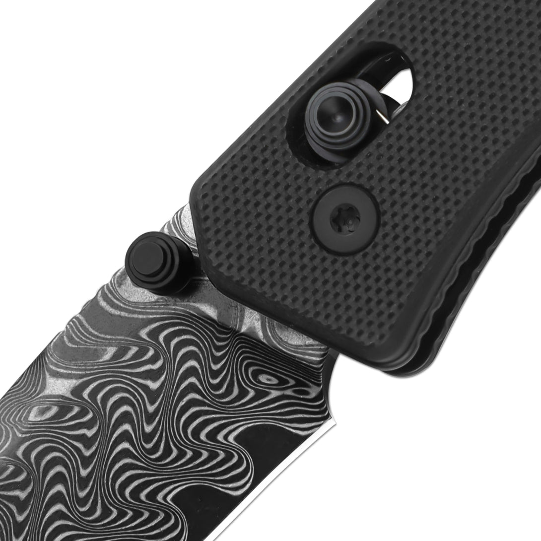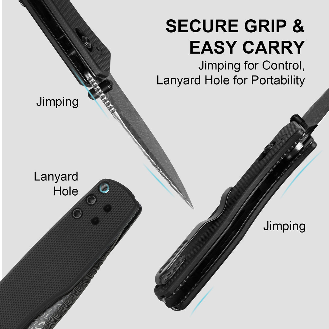Crafted from premium Damascus steel, this blade features a unique feathered pattern that combines striking aesthetics with exceptional sharpness, edge durability, and corrosion resistance. The Black Matte finish enhances its sleek, modern look while ensuring reliable performance for everyday tasks like unboxing, rope cutting, and light outdoor use.