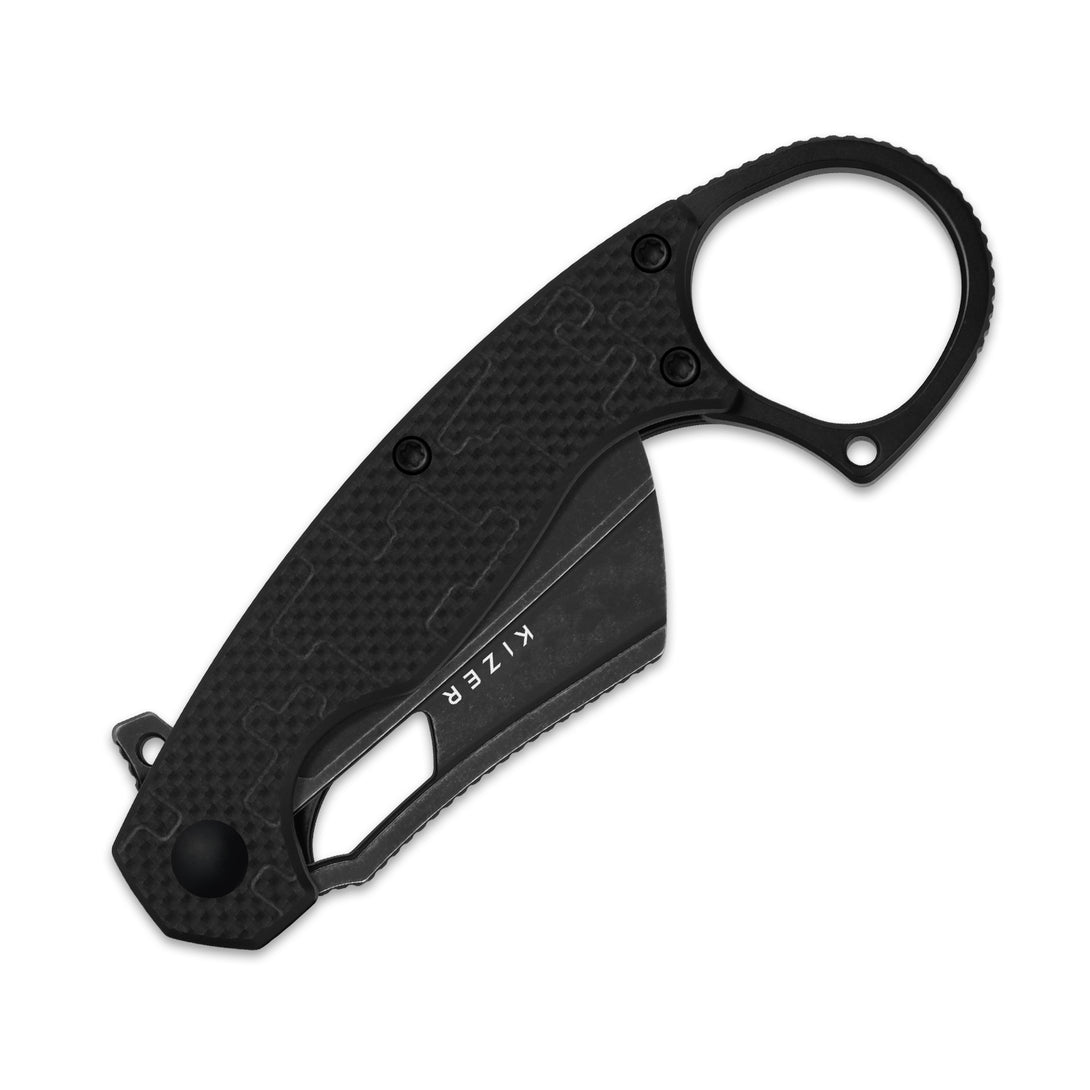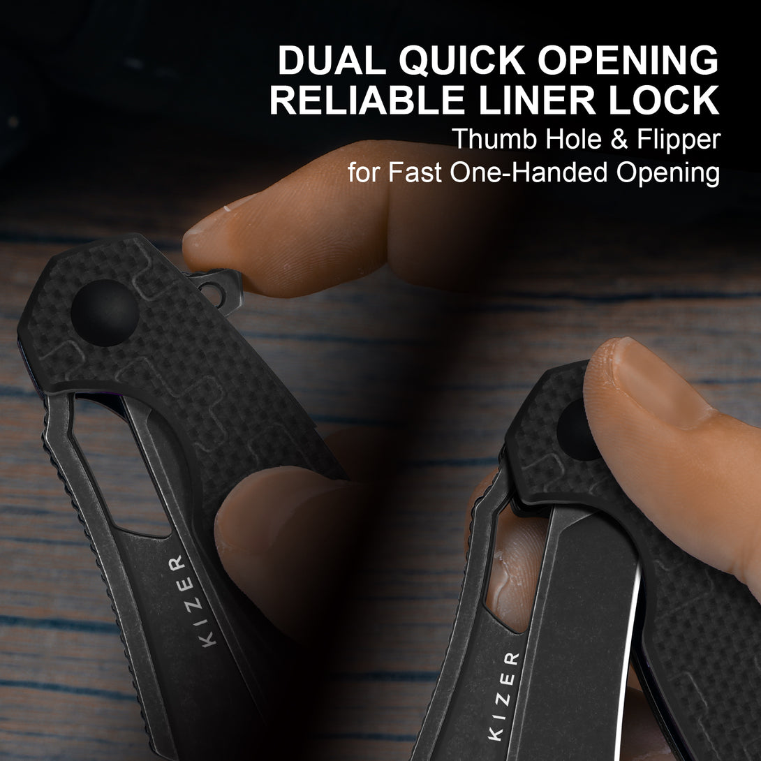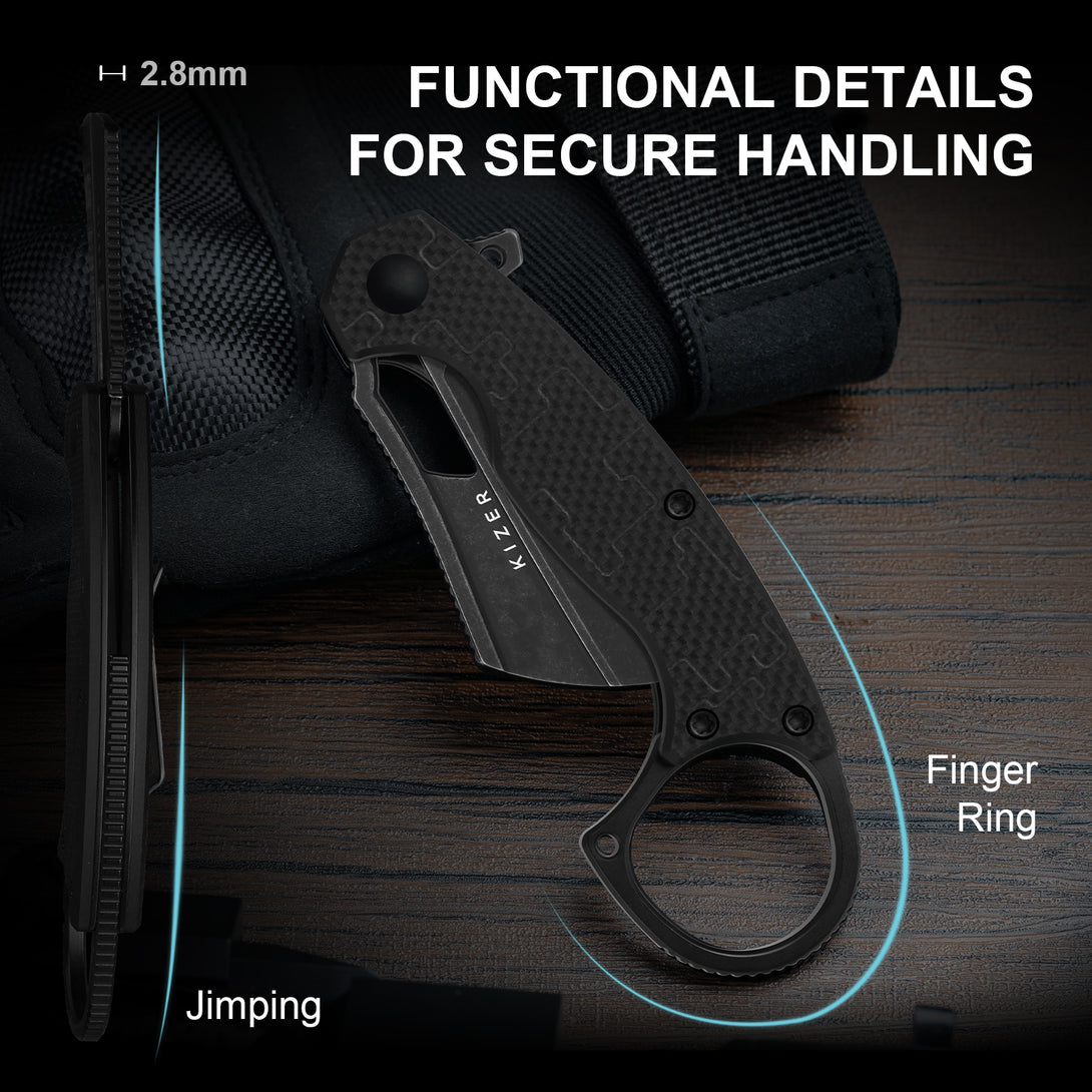 We've added aggressive jimping on the spine, handle, and hooked ring for total, slip-free control. The ring itself is designed for better retention and comfort. For the highest level of security, use the dual lanyard holes to add a paracord lanyard after opening, effectively preventing any chance of dropping the knife during defensive or high-stakes use.