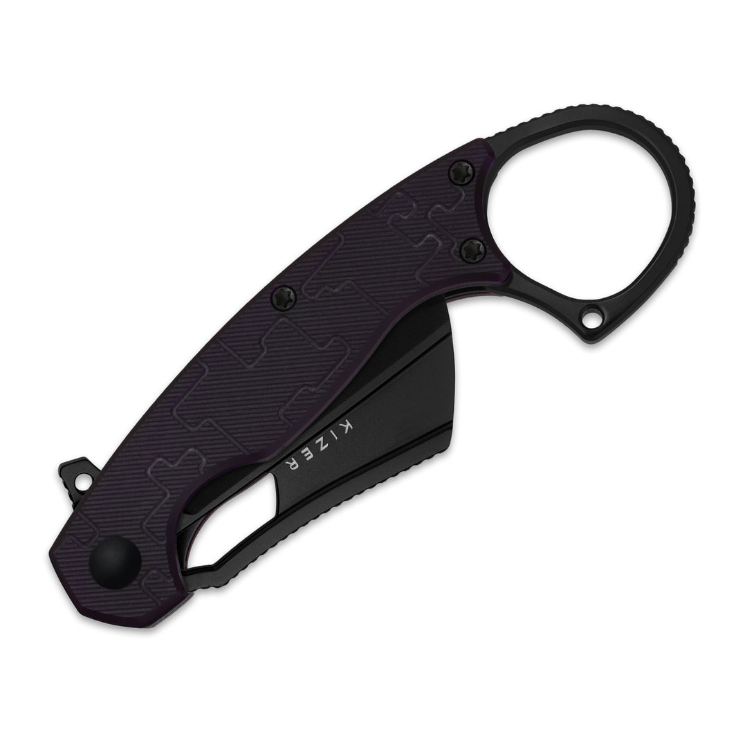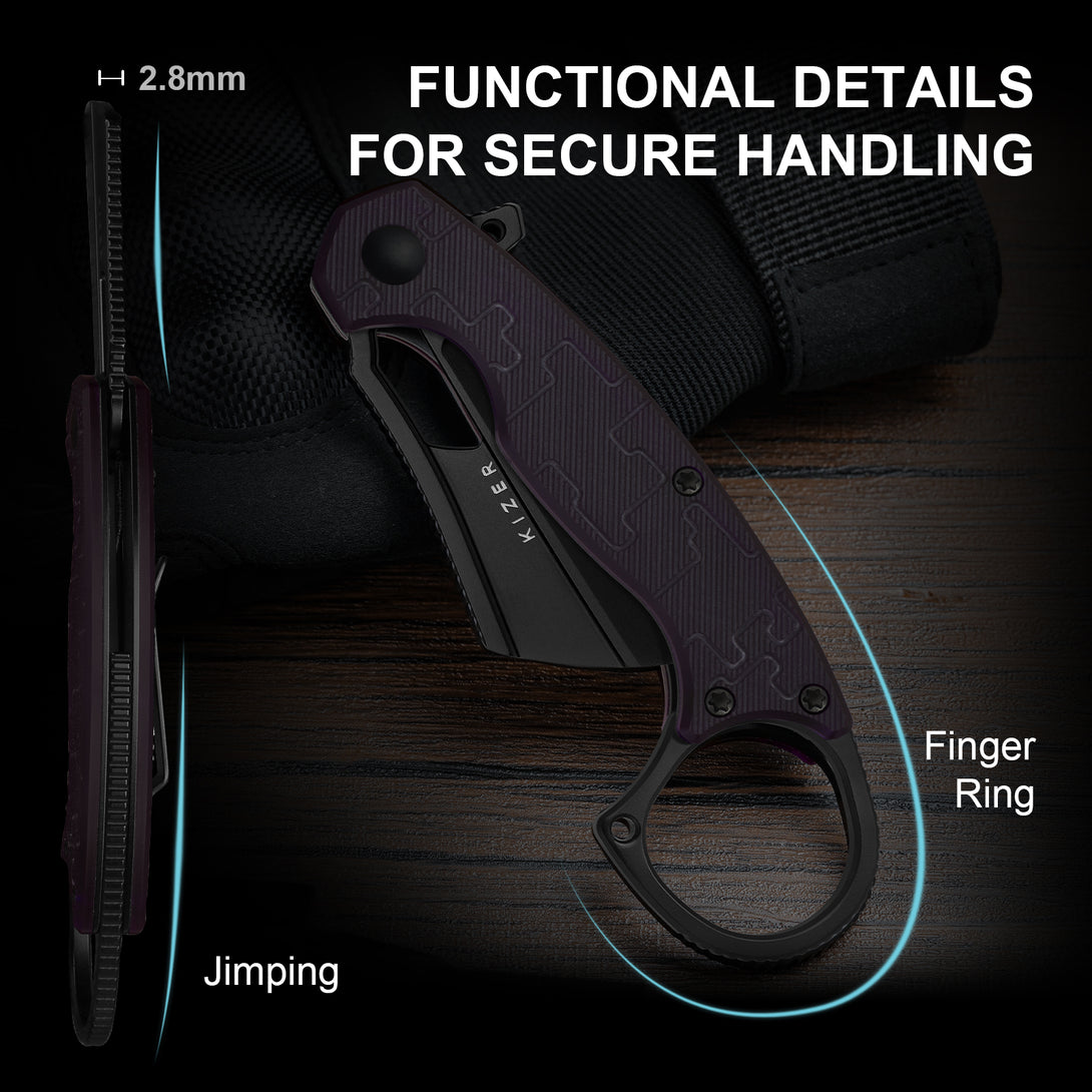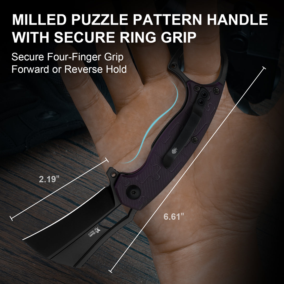 The handle features a deeply milled puzzle pattern that provides exceptional visual texture and a reliable, non-slip grip in any condition. The integrated finger ring secures your hand, enabling positive four-finger control in both forward and reverse grips. It's available in Chocolate Glacier Richlite, Purple PC, and Black G10, offering a unique look with long-lasting comfort and durability.