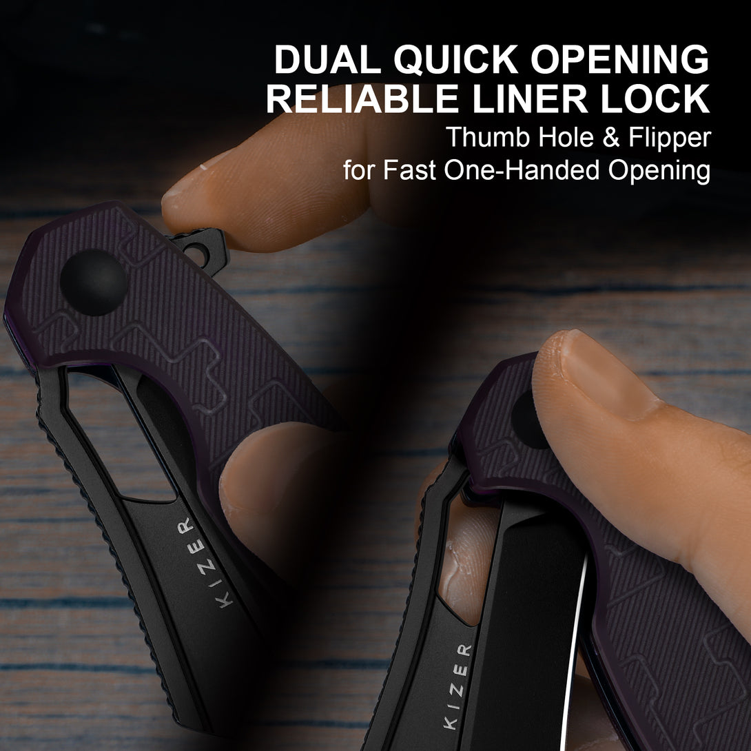 Multi-point jimping is strategically placed on the blade spine, handle, and the hooked finger ring for maximum control and anti-slip performance in all conditions. The hooked ring design enhances both retention and comfort. Dual lanyard holes enable you to attach a paracord lanyard after the knife is open, locking the knife into your hand and preventing slips during intense use in either grip position.