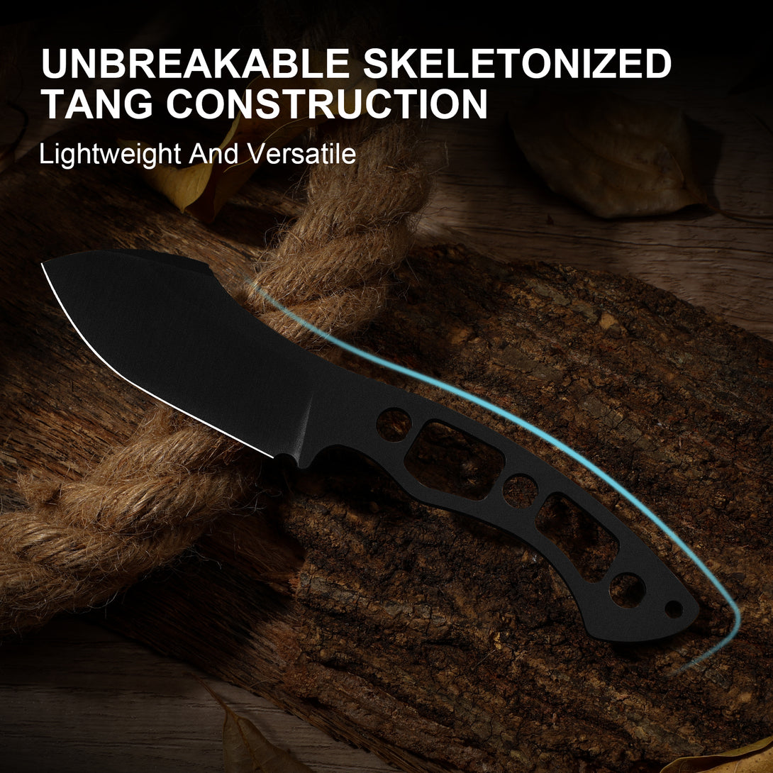 The  skeletonized tang   steel core runs from the blade tip to the handle end, ensuring extreme strength, while the weight-reducing holes in the handle reduce overall weight without compromising structural integrity. Additionally, the hollow holes serve as versatile rope holes for lanyards or straps, enhancing both carrying options and safety.