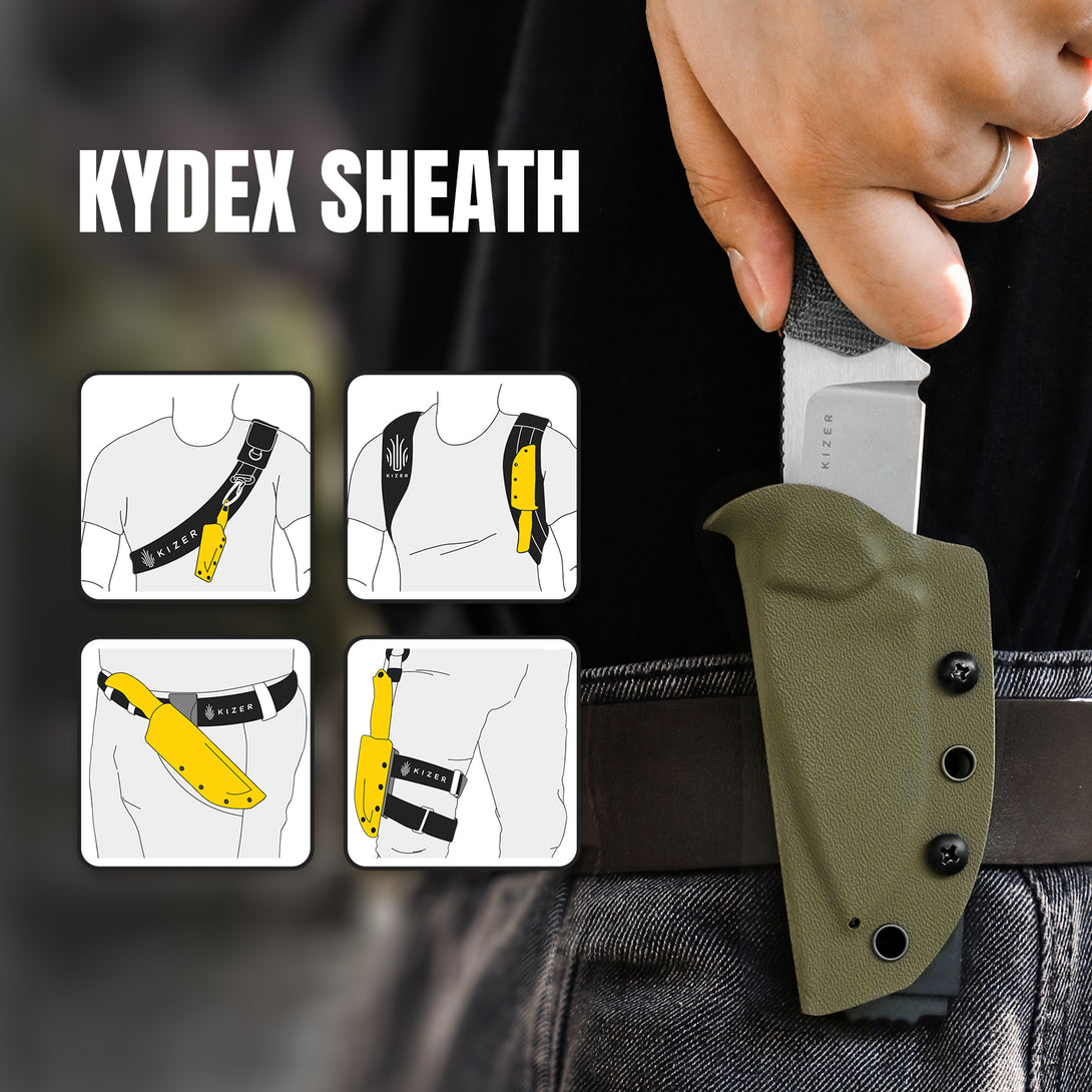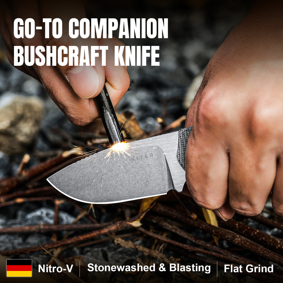 Non-rounded spine for fire-starting, multiple jimping for better control, and a rugged black Kydex sheath for versatile outdoor carry.Perfect for camping, hunting, and bushcraft tasks such as carving, chopping, and food preparation.