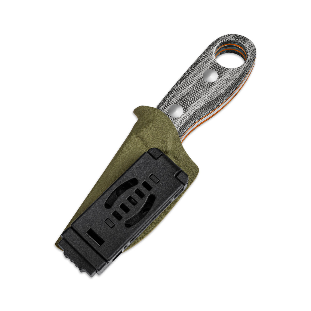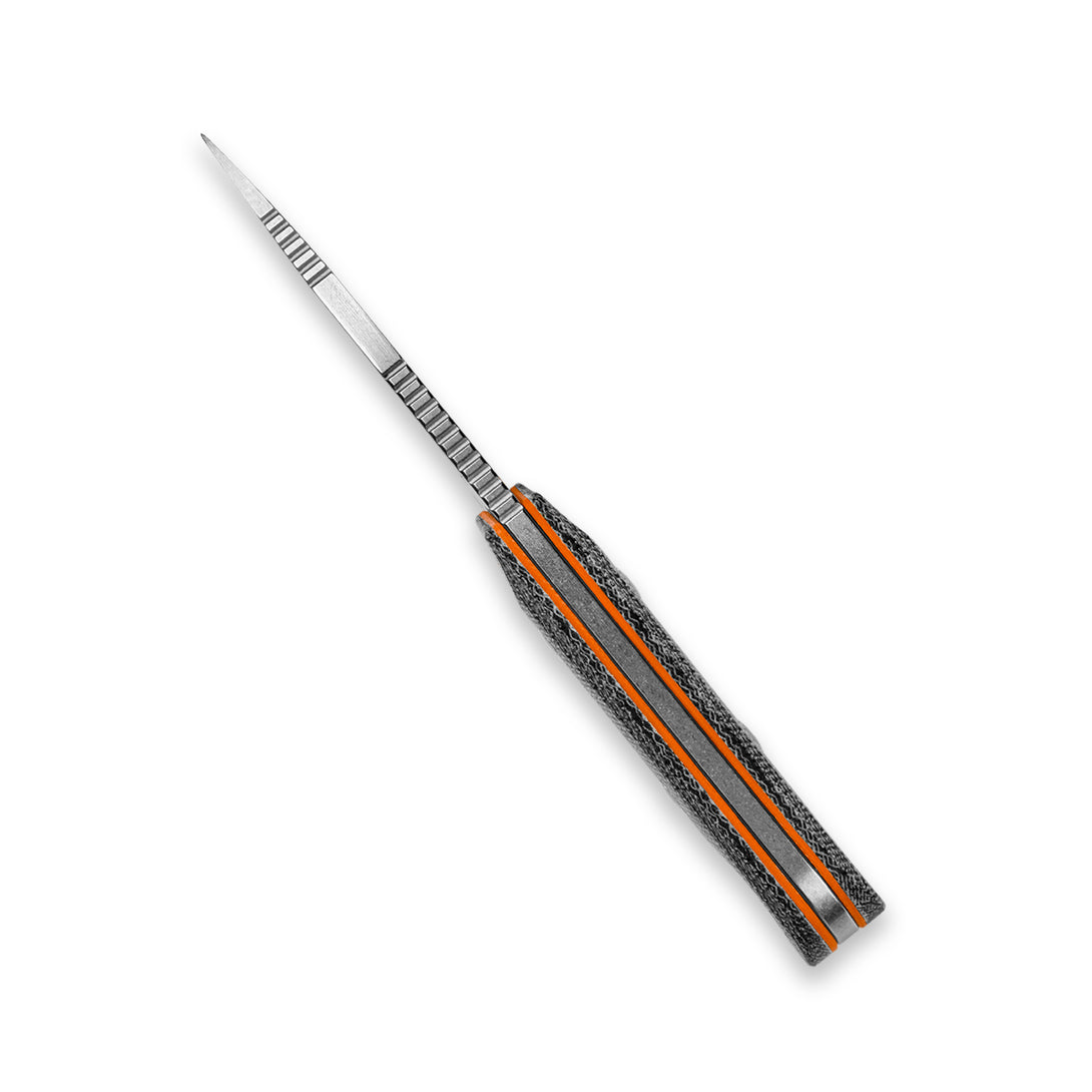 Dual-material black micarta & orange G10 with ergonomic curved design for a secure, comfortable grip.