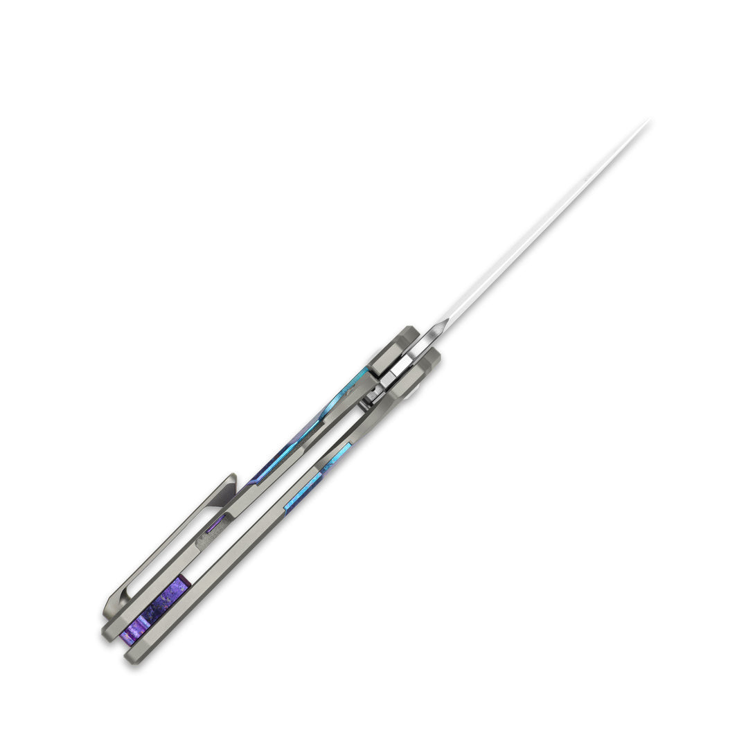 The handle masterfully pairs a lightweight yet rugged titanium frame with a striking crystallized titanium inlay. Through an advanced electrochemical process, the titanium surface transforms into unique crystalline structures that capture and refract light like natural ice formations. Each inlay is one-of-a-kind, with intricate, frost-like patterns and a dynamic iridescence that shifts between blue, purple, and gold hues depending on the angle and light. The titanium frame not only provides exceptional structural integrity but also complements the inlay’s brilliance with its sleek, modern profile. This combination results in a handle that is as visually captivating as it is functionally dependable.