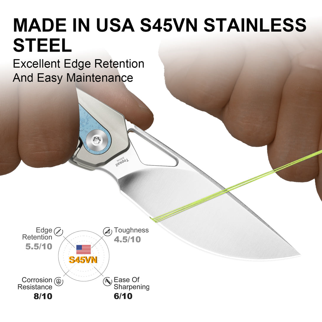 The blade is crafted from S45VN stainless steel, a premium powder metallurgy steel that offers an exceptional balance of edge retention, toughness, and stain resistance, making it an ideal choice for everyday carry and outdoor tasks.